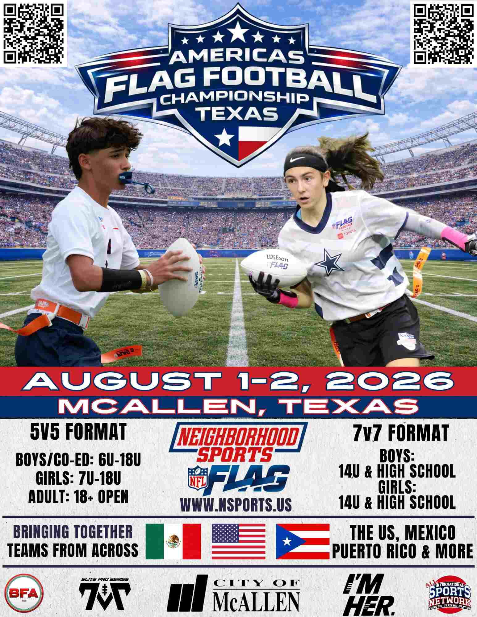 The Americas Flag Football Championship – Texas is coming to McAllen, Texas on August 1–2, 2026, bringing together top flag football talent from across the United States, Mexico, Puerto Rico, and beyond for a premier international competition.